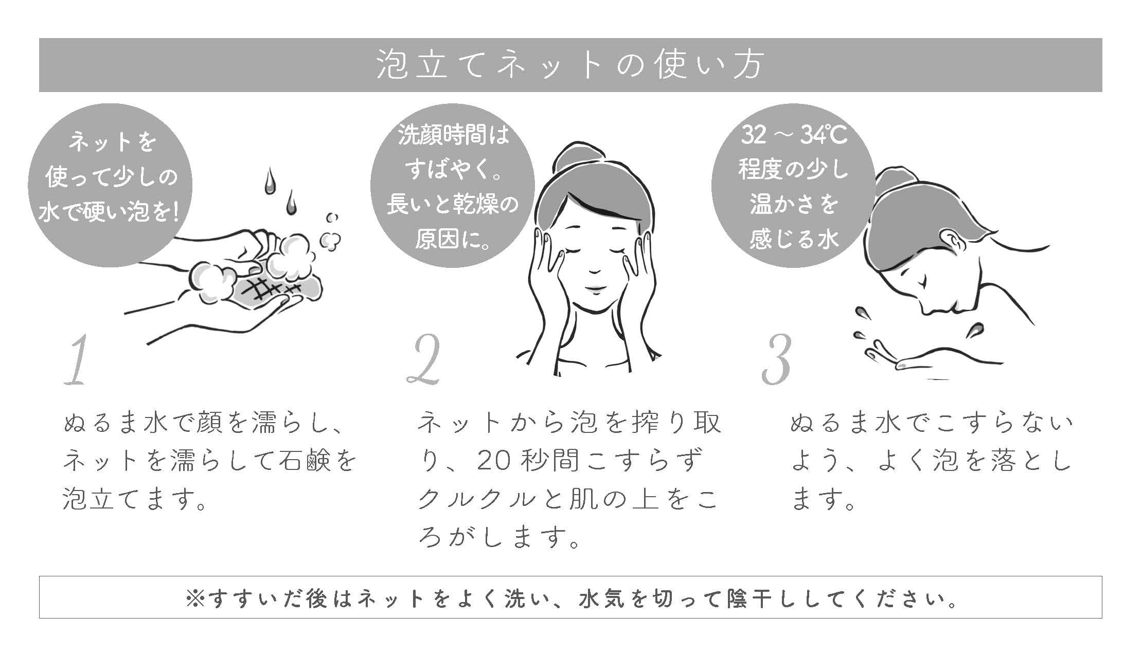 やわらか素材の日本製泡立てネットです。手肌にやさしく、きめ細かい濃密泡が素早く作れます。